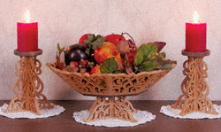 Bowl is 11" in diameter, Candleholders are 6" tall; Wood: Bowl:1/4" thick red oak, 1/4" thick walnut; Candleholders:1/4" thick red oak, 1/4" thick walnut; Saw: Scroll saw; Paints: 2506 Black, 2001 AntiqueMore InfoNo More Information Available- $10.45 USD