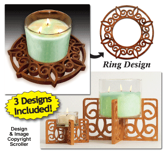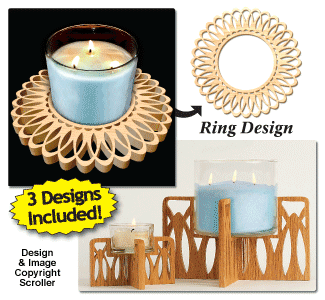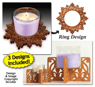 Our delightful Candle Rings are made using three layers of corresponding scroll designs. Each project holds a candle jar up to 4" in diameter. Stain, paint or use contrasting species of hardwoods to create your own personalized look!! Add inexpensive embellishments, such as stick-on...- $7.45 USD