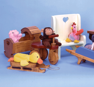 Eight popular furniture pieces sized to fit bean bag animals, small dolls or bears 6" to 12" tall. Full sized pattern to make all the designs shown. More InfoDESCRIPTION:EIGHT LITTLE COUNTRY THINGS DIMENSIONS:SCOOTER 8" T X 8-1/2" L BUGGY 8" T X 10-1/2" LDESK...- $7.45 USD
