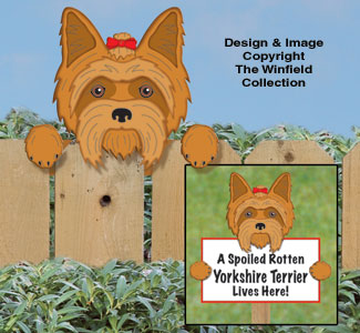 Someone let the Dogs out!! And this one is very curious about what is happening on the other side of your fence. Our realistic looking Yorkshire Terrier Fence Peeker design simply slips over the top of most fences and will have your neighbors howling with laughter. A Bonus Pattern is also included to make the Spoiled Rotten Yorkshire Terrier yard sign shown.