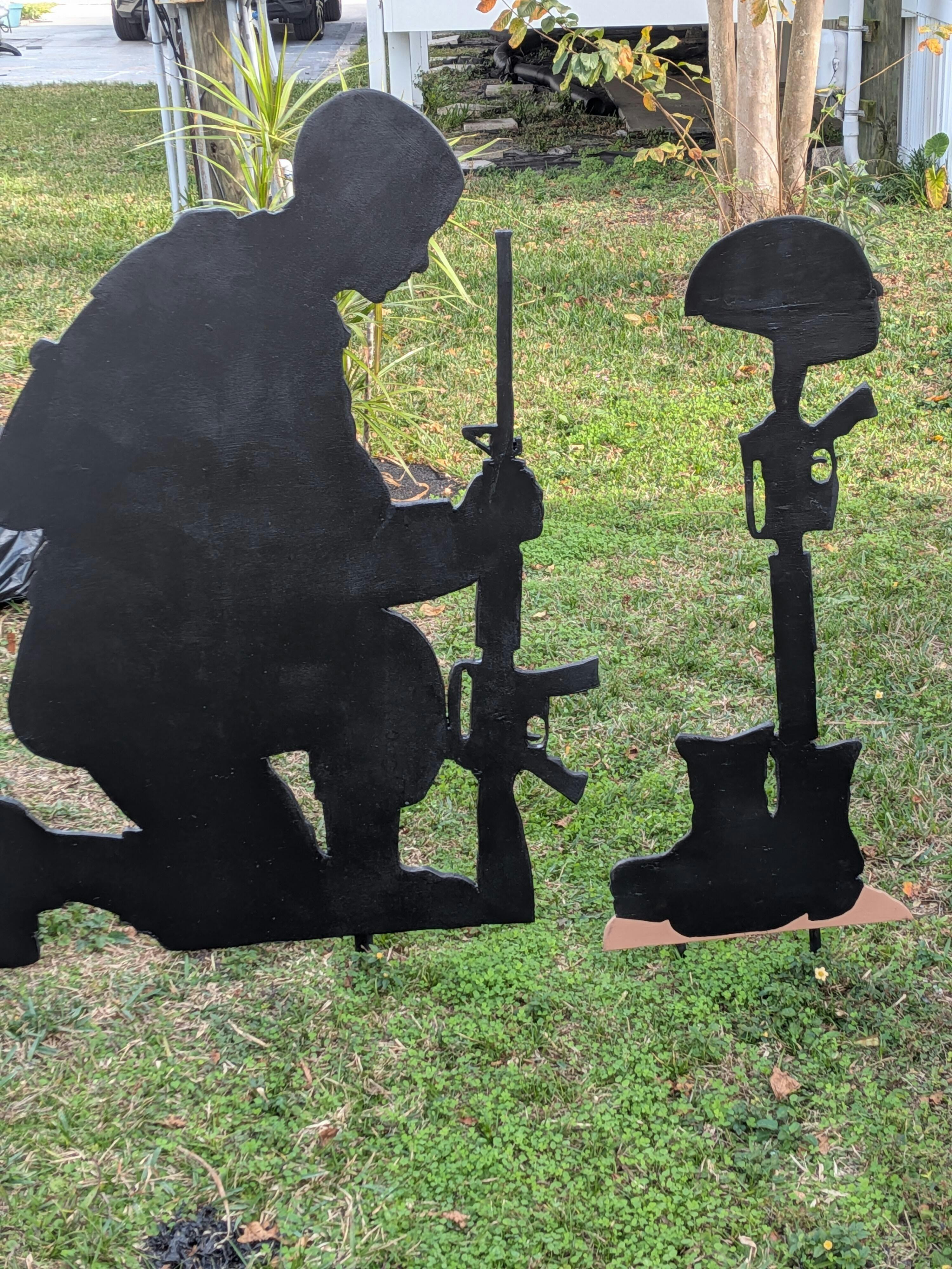 This kneeling soldier praying by the Battle Cross of a fallen comrade is an honorable way to pay tribute to our servicemen and women lost in battle and to remind all who see it of the real cost of war.