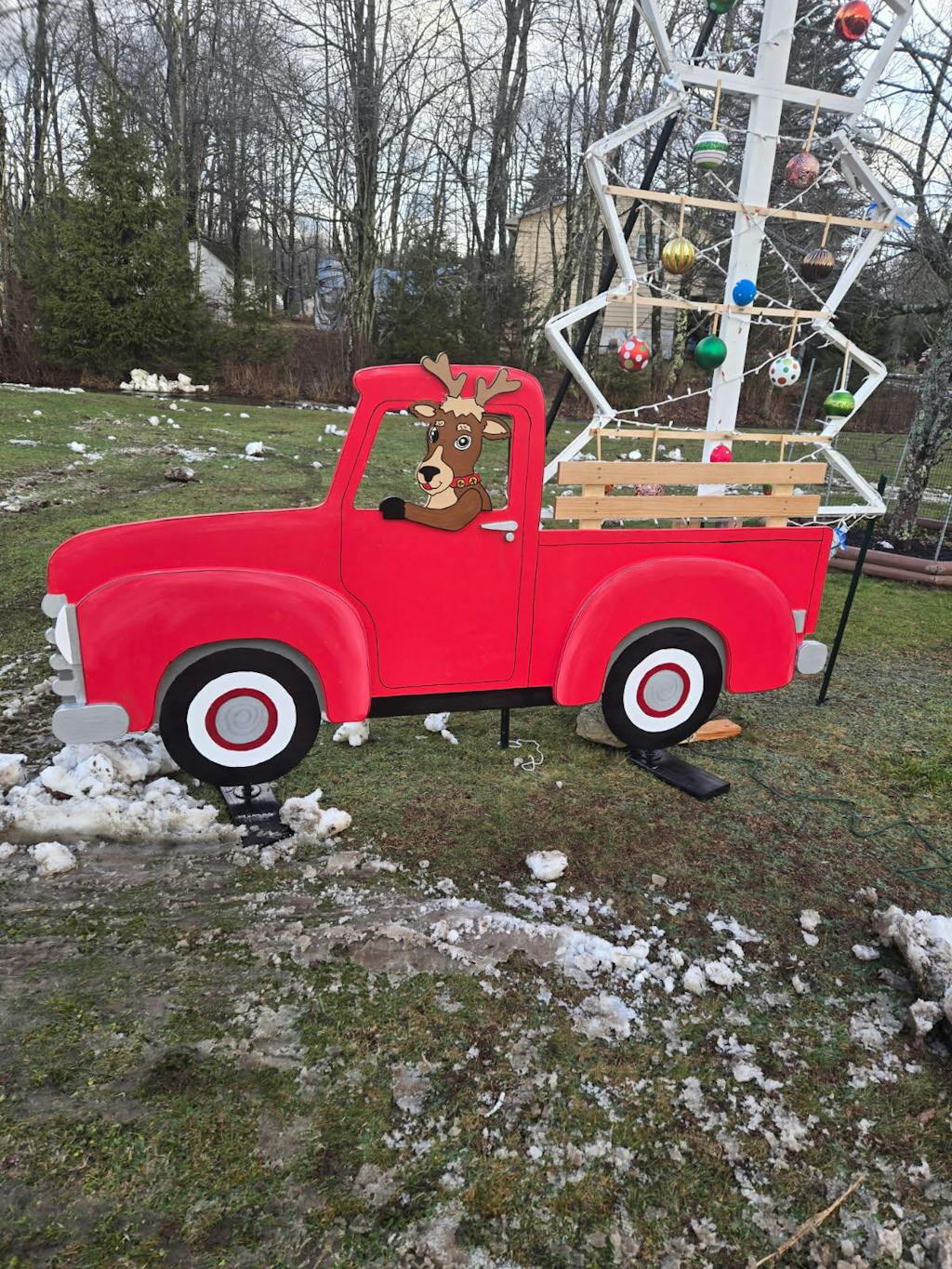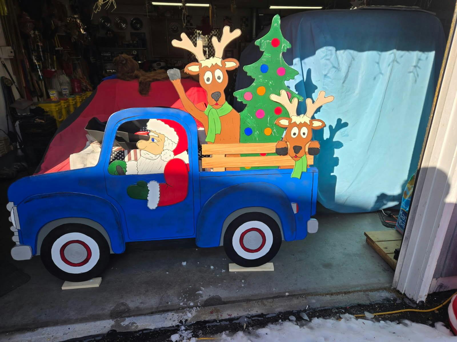 You can display it in your yard year round.....simply change the decoration in the truck bed and the door sign to celebrate the season, holiday or special event. This is a full-size pattern with instructions to make just the Truck with wood rack. Patterns for different Large Size Truck Cargo with Signs are available separately (several shown below). (47" tall x 95" long)