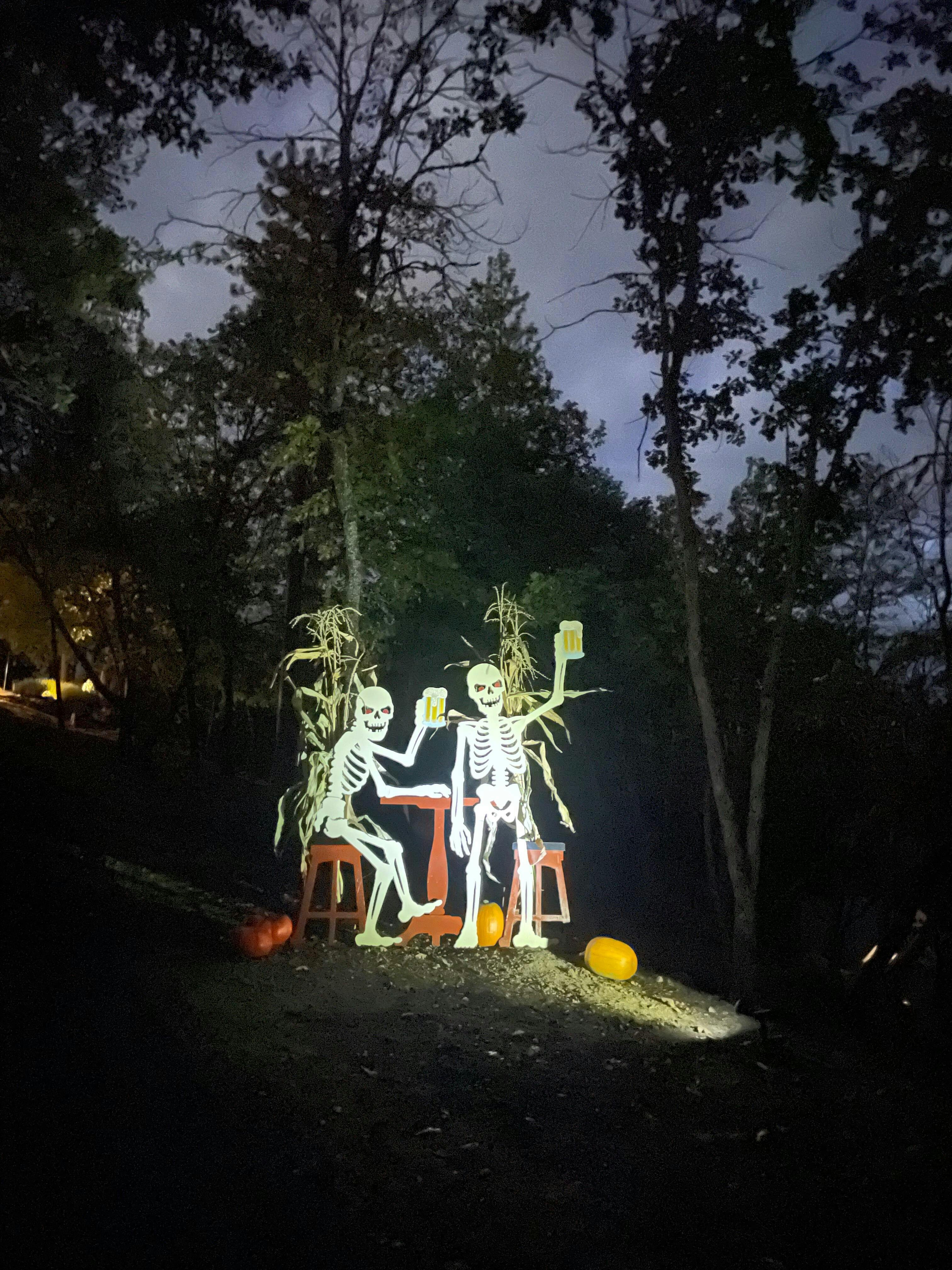 They're good buddies enjoying a beer, raising their mugs in a Halloween cheer!