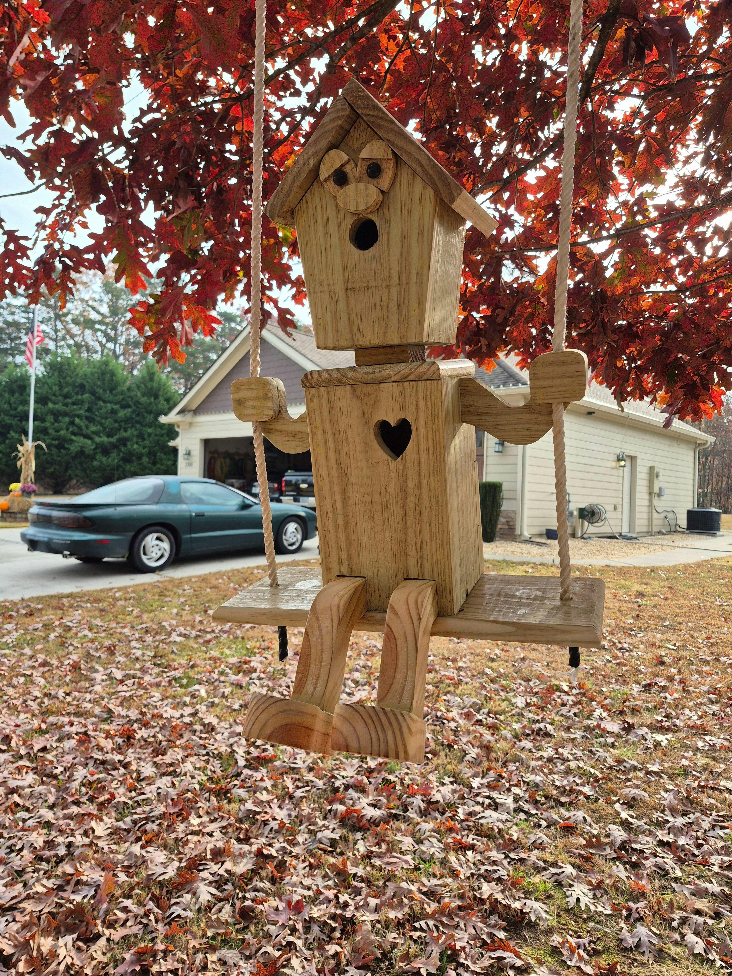 Just hang the two swing ropes from a high tree limb and watch the fun as the birds begin to move in. A fun and easy project to make from weather resistant cedar and pressure treated boards. Backs are hinged for easy clean out. (25" tall)